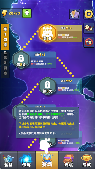 - 进入关卡:主界面点击「赛场」,优先完成主线关卡以获取基础装备,装备齐全后方可参与玩家竞技。