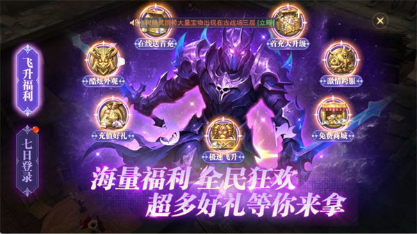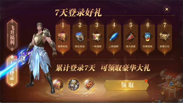 累计登录7天即可免费领取暗黑时装、一转/二转翅膀、武器幻化等开荒关键道具,零氪玩家也能快速成型战力。