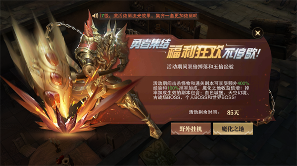 活动持续85天,期间享受五倍经验、双倍掉落、魔化之地收益倍增,是快速升级与刷取神装的黄金窗口期。