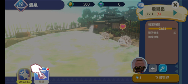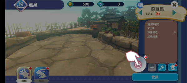 3、首站聚焦「飞鼠泉」——点击温泉图标,启动建设流程;