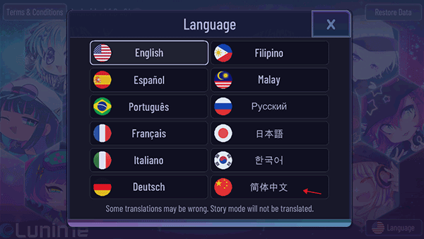 1、启动游戏后,在主界面右下角点击「Language」按钮;