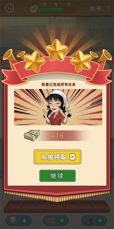 ③ 面对络绎而来的街坊邻居,根据顾客头顶气泡提示(如“要一瓶橘子味汽水”“买两块奶糖”),在琳琅满目的货架上快速滑动、精准点击完成三消式配货——找得越快,好评越多,收入越高!