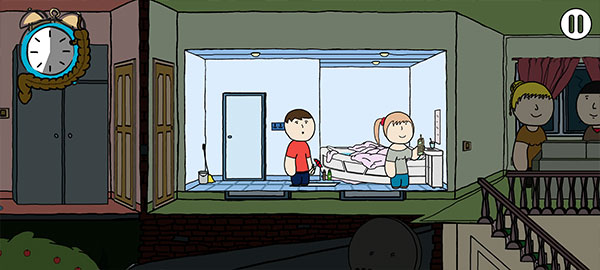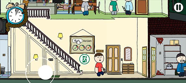 4、以「派对」为例:左下角滑动呼出隐形轮盘,操控主角边憋边探房;靠近物品或NPC时自动弹出交互气泡,轻点即可触发关键事件。