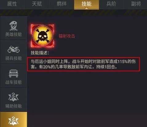 技能页涵盖英雄技、骑兵技、战车技、辅助技及高爆发合击技——当特定英雄组合上阵,自动触发专属合击,是PVE推图与PVP对抗的核心破局点;