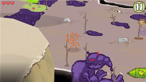 注意脚下蓝紫色熔浆区域!它会持续造成伤害,切勿靠近。真正的突破口藏在画面下方——那支看似普通的“树叶画笔”,正是你的第一把万能钥匙:在干枯树枝上画出树叶,即可瞬间触发双重效果——角色原地复活 + 自动清剿周边怪物!