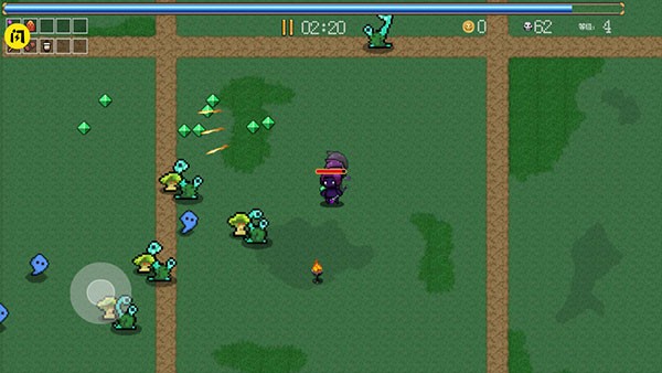玩家将操控角色深入随机生成的像素地牢,在自动攻击基础上专注走位闪避,持续收割蜂拥而至的怪物。每击败敌人即掉落金币与宝石,实时填充顶部进度条;条满即触发“升级节点”,可自主选择强化属性、解锁新技能或升级已有能力——成长路径由你定义,每一次通关都独一无二。