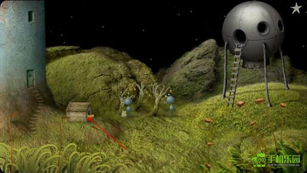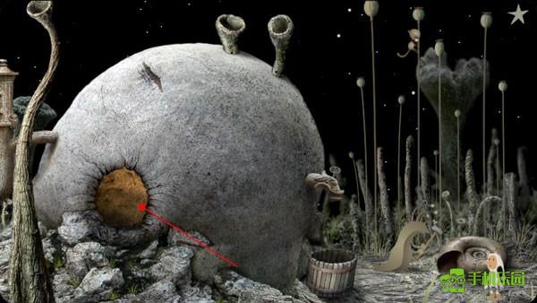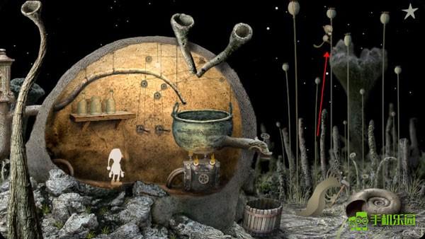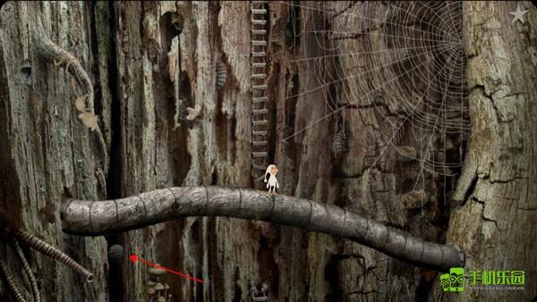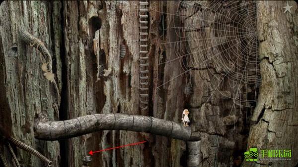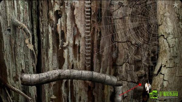 2、点击飞船中的主角,他被树枝卡住;随后点击左侧树枝上的虫子,使其爬至卡主主角的树枝并松开主角;最后点击左下角道路前往下一场景