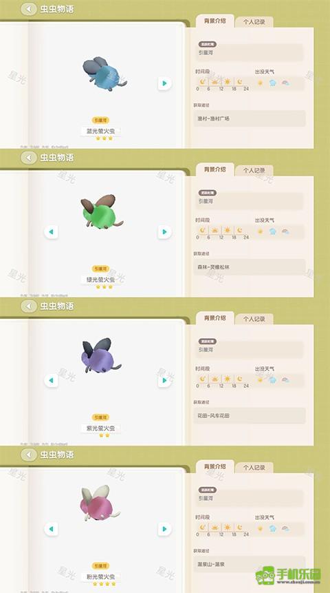 【限定昆虫图鉴】 ? 蓝光萤火虫(渔村广场) ? 绿光萤火虫(灵橡松林) ? 紫光萤火虫(风车花田) ? 粉光萤火虫(温泉区域)|第二周开启虫潮事件