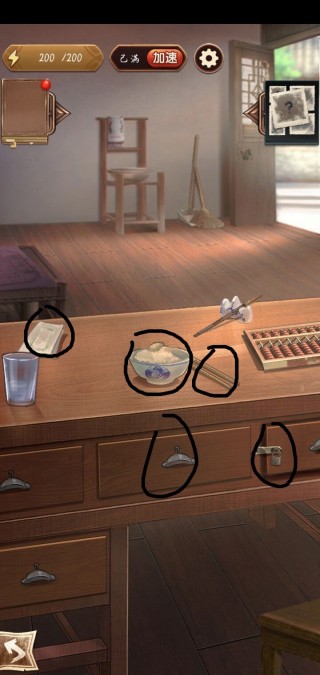 2、转向书桌区域:撬开桌面下方锁扣,获得「抽屉铜锁」及「一叠汇票」;桌面明处可取「借据」「竹筷」「白饭一碗」——注意白饭余温尚存,暗示时间刚过不久。
