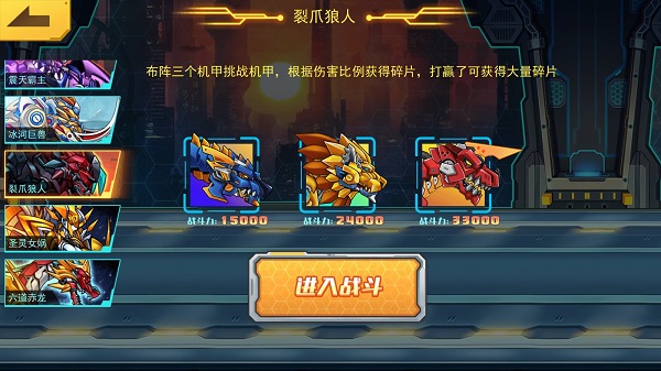 碎片获取途径:每日副本→选择「烈爪狼王」挑战关卡→上阵3台已有机甲参战。无论胜负,均可按伤害比例结算奖励——战败亦不空手,每次挑战稳定掉落5个碎片,稳扎稳打,积少成多。
