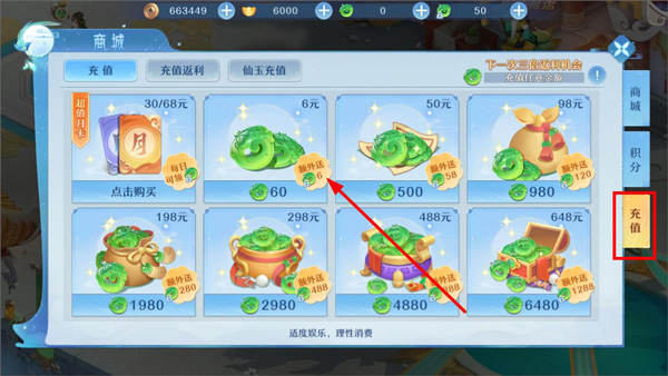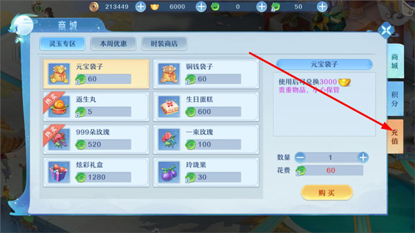 2. 进入商城页,选择【充值】按钮(支持灵玉、时装、周惠礼包等多种充值方式);