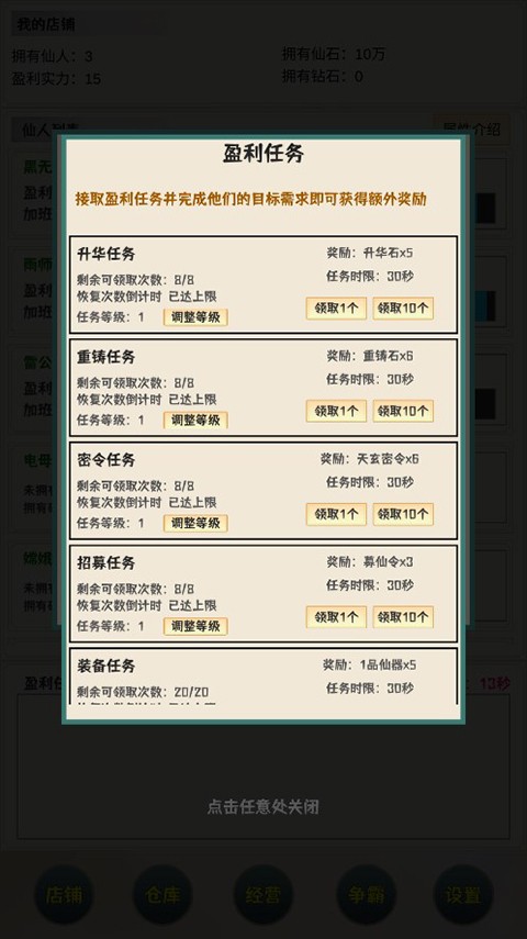 《我在仙界当富豪》是一款颠覆传统修仙框架的策略经营向放置游戏——在这里,没有无脑刷怪,没有强制肝氪,所有装备、招募令、神器、阵法乃至渡劫资格,均需通过完成“盈利任务”解锁与升级。你将以凡人之躯入仙门,靠真实可计算的收益逻辑滚动发展:每分钟进账多少仙石、角色效率如何叠加、任务档位怎样匹配当前战力……一切成长皆有迹可循。这不是玄幻爽文,而是一场精密运转的仙界财富实验——你的智慧,就是最强金手指。