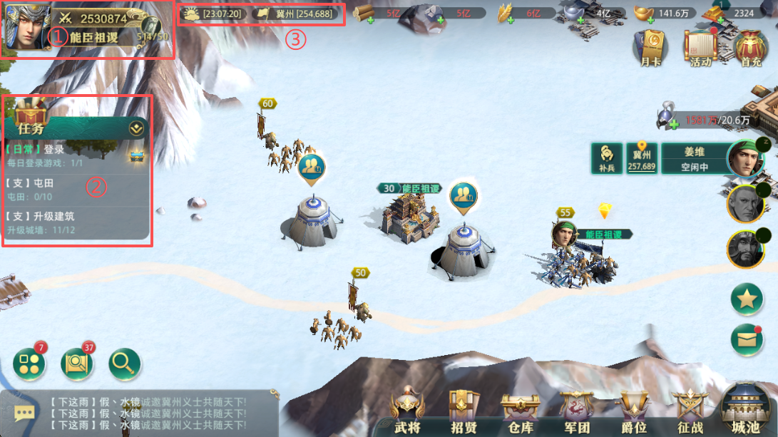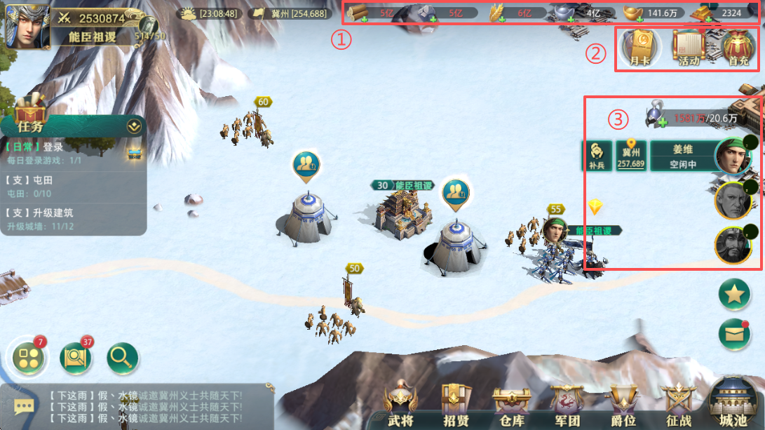 前期务必占满四级田矿与银矿;随等级提升逐步替换为高级资源点;推荐配比:伐木场≈采石场>田矿≈银矿;演义副本资源(招贤令)按需领取,切忌过早消耗。