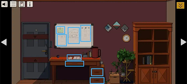 逐项点击黑板内容:绿色纸条【贝拉压力自述】、三颗星【近期计划表】、三个三角【老鼠异响提示】、三个修理项【电视频道噪音+收音机配件未到】;查阅桌面【调查局全员通知】、桌下抽屉【第二个胶带】、右侧第一抽屉【前期调查日志】、第二抽屉【人员档案】。