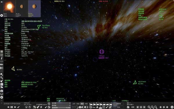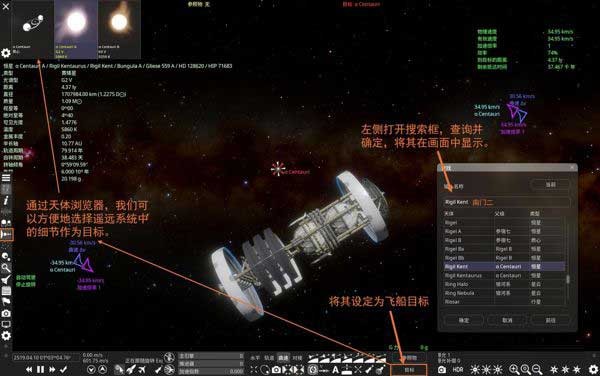 设定目标是曲速启程的第一步。通过左侧「查找」+「天体浏览器」,可快速定位南门二、K2-18b等真实系外天体,并一键设为航行终点。