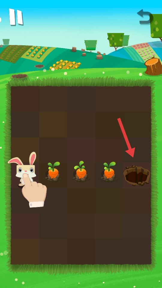 按屏幕指引,手指滑动绘制路线,确保兔子沿胡萝卜路径行进,并最终抵达洞穴。