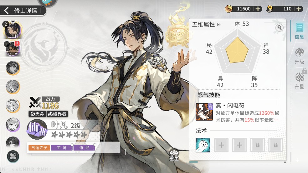 怒气技能【真·闪电符】:对敌方单体造成1260%秘术伤害,并有15%概率施加1回合晕眩效果,精准压制关键目标,奠定战局先手优势。