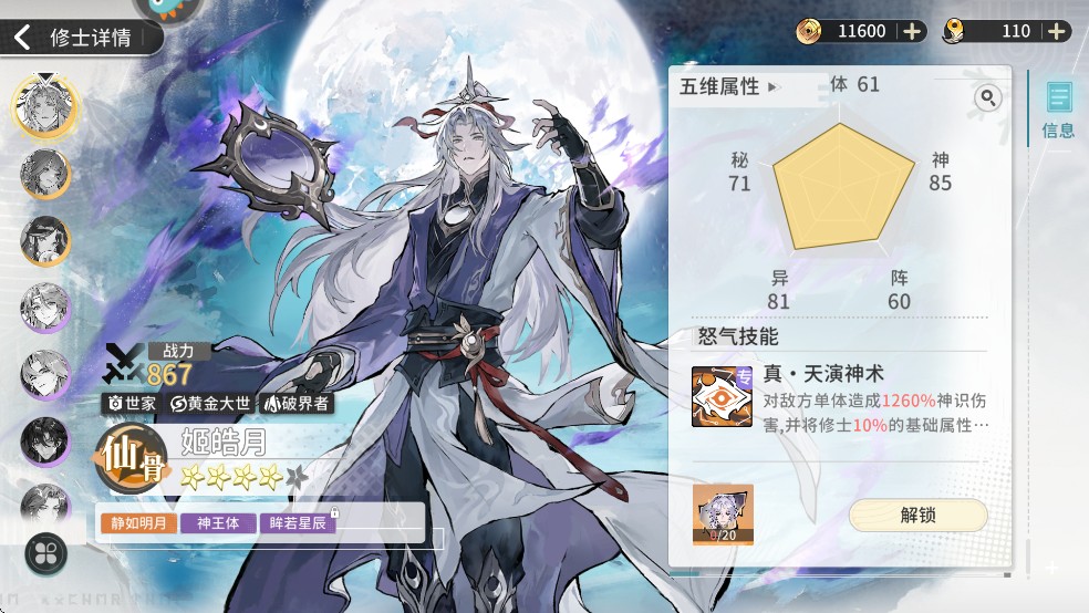怒气技能【真·天演神术】:对敌方单体造成1260%神识伤害,并永久吸取其10%基础属性(最高不超过自身对应属性的50%),越战越强,成长型战术核心。