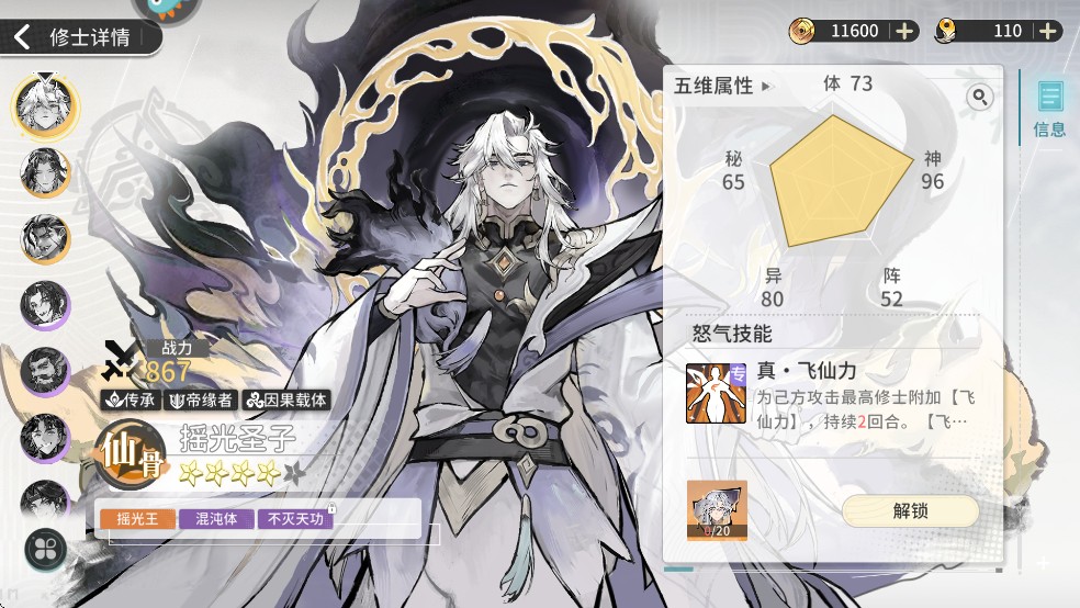 怒气技能【真·飞仙力】:为己方攻击力最高的修士附加【飞仙力】状态,持续2回合;期间该修士每次攻击均提升5%最终伤害,团队增益天花板,决胜团战关键支点。