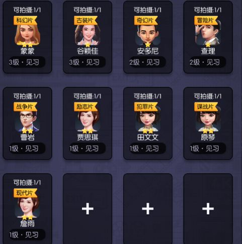 建议按类型均衡配置,每类(科幻/奇幻/现代/励志/战争/冒险/古装/犯罪/谍战/灾难)各配1名,总数控制在10人左右。导演星级直接影响场景拍摄时的属性加成概率(1星+10%,2星+20%),当前版本最高可招募2星导演(新马服支持4星)。优先用“导演证”置换高星导演,让每一次开机都更稳、更出彩。