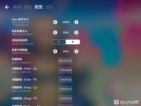 推荐降低【背景不透明度】(建议30%~50%),提升Note辨识度;调整【判定效果大小】至100%~120%,确保打击反馈清晰不干扰节奏;Note颜色支持十六进制自定义,可按喜好替换(如经典红/蓝/黄三色系更利于快速识别)。