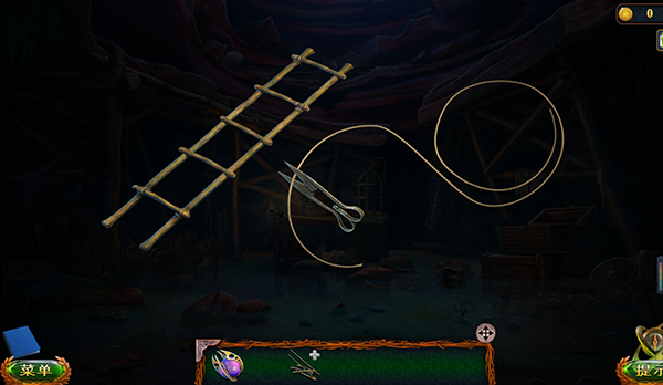 6、从箱中获取球面石与剪刀,组合梯子碎片修复木梯,再将绳子系牢并用剪刀裁剪固定;
