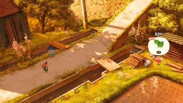2、详细路线:进入「小新种田」地图 → 选择左侧小路前进 → 遇钓鱼小孩需互动通过 → 继续前行至老奶奶田边;注意:她白天会因排水问题阻挡去路,必须等到黄昏时段她离开后,田中闪光点即为紫苏叶。