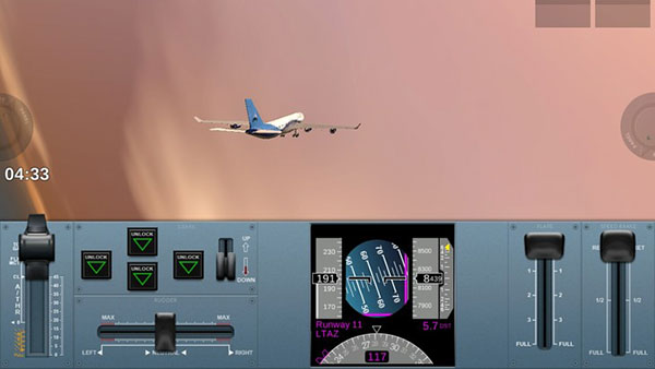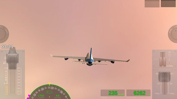 左手区域透明加速按钮控制推力,右手区域圆形仪表盘用于航向/俯仰微调;机身姿态通过手机倾斜实时响应,方向指令通过点击屏幕精准输入。起飞需严格满足速度阈值与襟翼角度匹配,着陆前必须同步调整下滑角、空速与跑道中心线——没有自动对正,没有容错提示,每一次成功都源于你对气流、重力与机械反馈的真实理解。