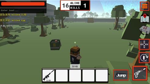 左上角实时显示当前生命值;右上角功能栏从上至下依次为:动态小地图、医疗包使用键、视角切换(第三人称/第一人称)、换弹键、攻击键、跳跃键;屏幕正上方白色数字为当前存活人数,黑色数字为个人击杀数;底部武器槽清晰划分主武器×2、副武器、近战武器、手榴弹五大模块,切换自如,应对瞬息万变的战局。