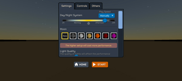 2、进入地图场景,可自定义夜空氛围——调节月亮颜色、亮度、云层密度,营造专属观赏环境;