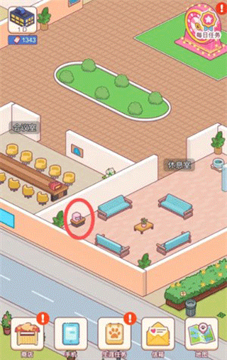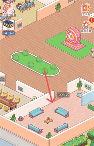 进入游戏后,首先进入【休息室】——这是员工休憩与设备部署的核心区域,点击任意空白区域即可开始布置。