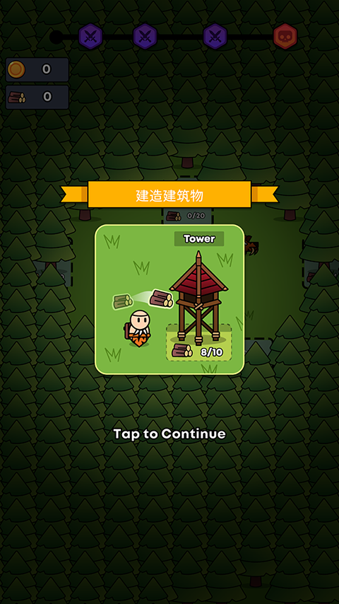 开局只需滑动角色靠近树木——斧头自动挥动,木材秒速入袋;随后移步至指定建造区,轻点即可部署防御塔、篝火、金矿等关键设施,全程无繁琐拖拽与指令输入。