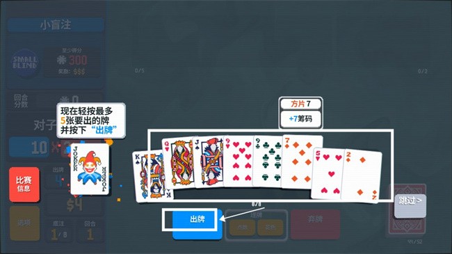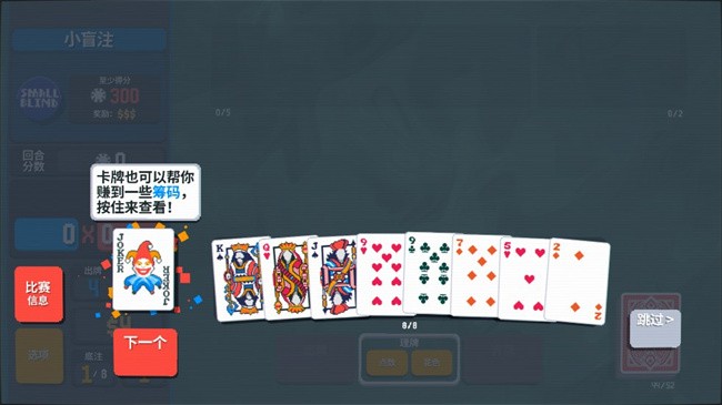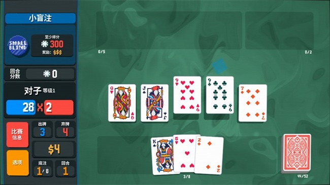游戏以“击败盲注”为终极目标:每回合需在出牌次数耗尽前,凑出高价值牌型,赚取指定筹码(如小盲注=300筹码)即可获胜。