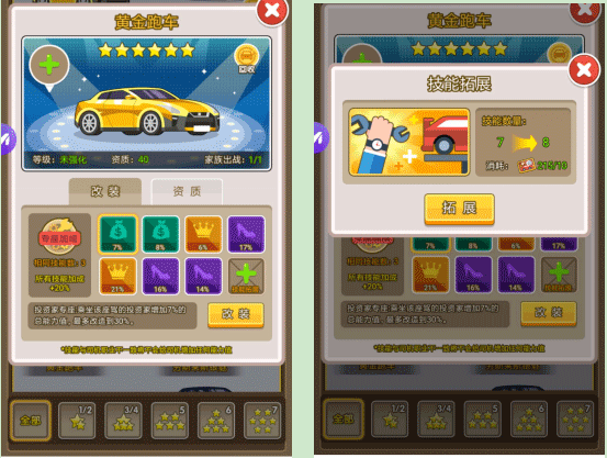 6星车是平民玩家的性能天花板——7个基础插槽+可拓展至9槽,单卡拓展加成达20%,配合定制改装卡可达30%极限增幅。回收1辆6星车=10张拓展卡,建议保留8辆组成出行车队(前30名散金币+钻石),其余尽数回收反哺主力黄人。特别提醒:车辆进修需满150经验才提升资质,低等级人才勿配高星车;每日豪车展进修+定期改造,让座驾20级后流光溢彩,既是实力象征,更是真金收益。