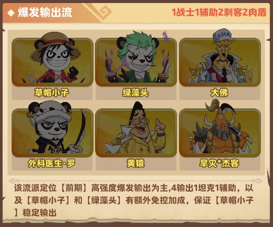 战术要点:前排稳住节奏,双输出快速压低敌方血线,罗与罗宾保障容错率,适合绝大多数终章章节。