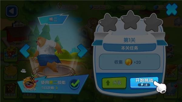 3、自由切换角色形象——熊大稳重、熊二迅捷、光头强控时、超级熊大自带复活,不同技能直接影响制作节奏与容错率;