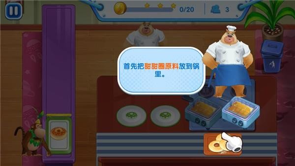 3、根据订单提示,拖拽食材、操作厨具——比如点击甜甜圈放入油锅,炸至金黄后捞出装盘,再快速递交给等待的小伙伴;