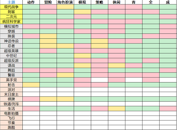 游戏机搭配表格