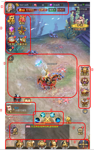 ① 玩家信息区:实时显示等级、血量、战力、金币、钻石等关键数据;