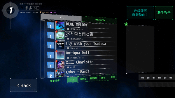 拒绝罐头BGM!收录大量高完成度原创曲目,并斥资购入多首正版授权曲——每一首都经开发者亲自谱面适配,确保节奏密度、难度曲线与情感张力三重匹配。曲库按Tier分级:蓝谱(Tier1–5)开放即玩,黄谱(Tier6–10)达10级解锁,红谱(Tier11–15)需会员资格,紫谱(Tier16–17)则需专属入场券——成长有迹可循,突破水到渠成。