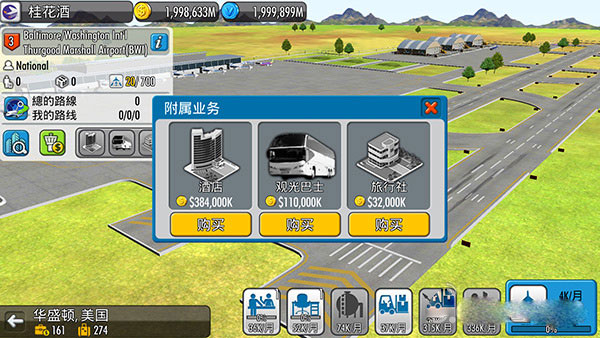 资金有限?别担心——游戏为你精心设计了极富策略感的成长路径。开局选择巴黎、东京、迈阿密等高客流旅游城市作为枢纽基地,立即锁定稳定客源;随后在两个城市间开通首条短途客运航线,优先采购经济型支线客机,稳扎稳打积累第一桶金。