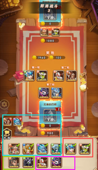 四轮公共牌发放完毕后,进入最终布阵阶段:蓝色框为个人手牌,红/绿/紫框分别对应三轮公共英雄(海妖&巨魔、万兽之王&暗夜君主、战神&暗影刺客);勾选6名英雄→点击布阵→拖拽调整站位→倒计时结束即刻开战!牢记合成法则:同英雄最多携带4张;2张升6星,3张升10星,4张直达15星巅峰战力——合理控牌,才是胜率基石。