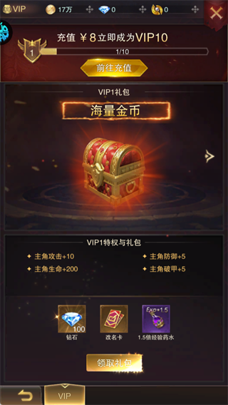 2、VIP奖励:优先领取V10礼包中的钻石与经验药水,再通过8元充值锁定VIP身份,永久享受所有特权加成。