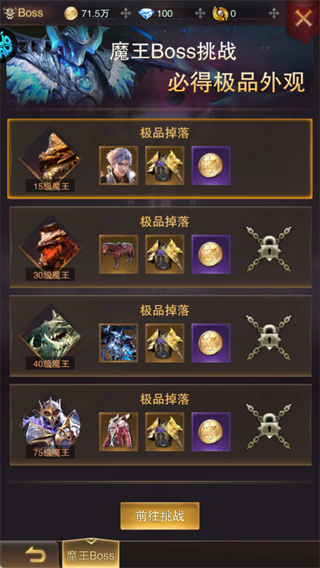 5、Boss挑战:魔王副本为资源核心产出地,高频刷新+多难度分层,掉落随从碎片、魂卡精华、稀有武器卡,点击【前往挑战】一键参战。