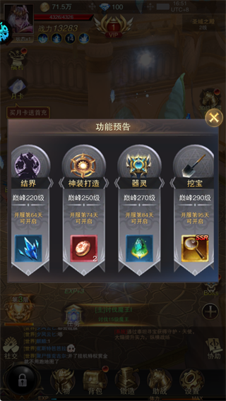 7、功能预告:巅峰等级与开服天数双重要求解锁高阶玩法(如跨服战场、魂卡融合、公会远征),前期专注主线+VIP养成,为爆发期打好基础。
