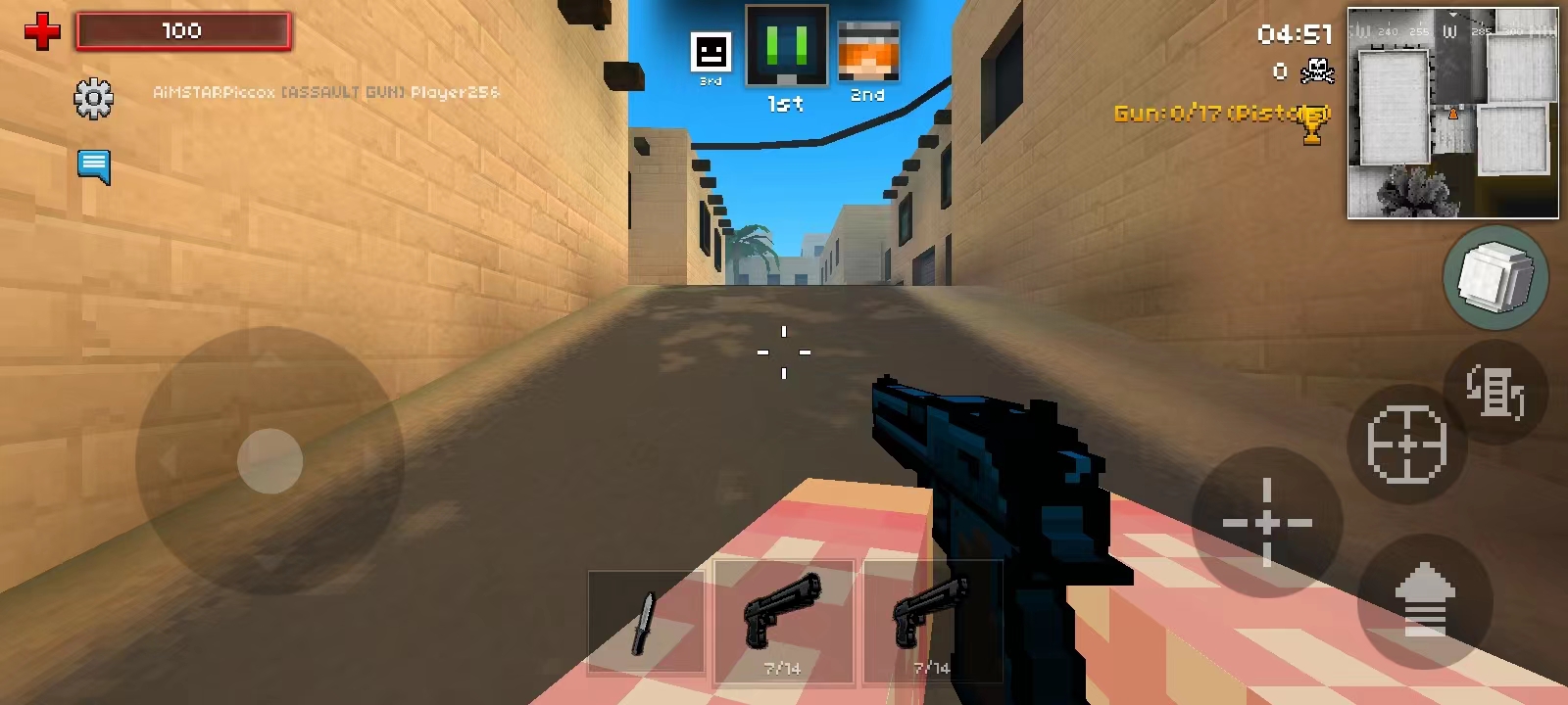首次进入游戏,只需三步轻松开局:①滑动浏览数十款个性像素皮肤,选定角色外观后点击【新建】;②主界面直击【Play Now】快速匹配;③选择偏好模式——支持Quick Play(快速对战)、Free for All(自由混战)、Team Deathmatch(团队死斗)、Bomb Defusal(拆弹行动)、Capture the Flag(夺旗攻防)等十余种核心玩法。虚拟摇杆+智能按键布局,左手控位移,右手管射击/跳跃/瞄准,右上角实时小地图助你掌控全局。