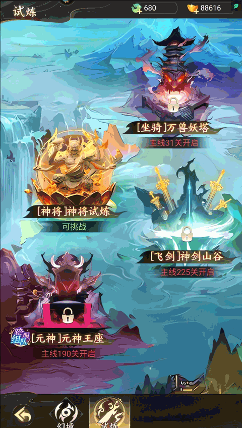神将培养:将招募而来的神将编入阵容,通过升星、神器装备、御魂激活等多维方式全面提升战力基础。