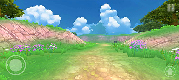 2、初始场景为静谧草地,左下区域虚拟摇杆控制移动,右下【跳跃】键助你跨越障碍,滑动右侧屏幕自由环视环境细节。