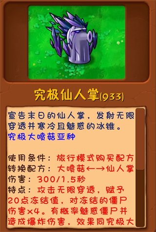 核心能力:持续向前方整行喷射冰冷魅惑烟雾,每0.5秒造成100点穿透伤害并叠加20点冻结值;对血量低于40%的僵尸有概率直接魅惑,转化为强力单位【寒冰高坚果雪爪僵尸】。