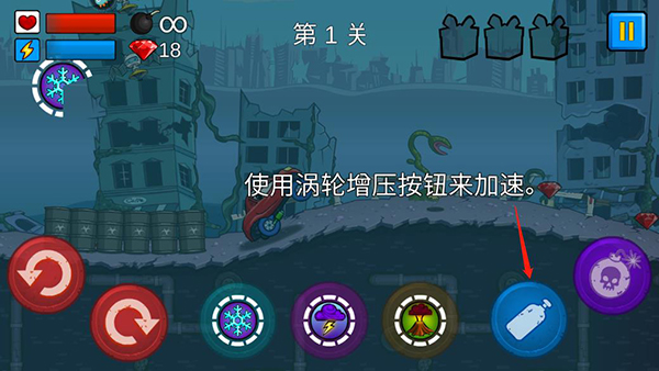 游戏加载完毕 → 点击PLAY → 选择存档 → 进入关卡01 → 再点PLAY即刻出发!操作逻辑清晰直观:左侧双按钮控制车身左右倾斜(维持平衡),右侧涡轮键瞬时提速,遇到尾随敌车长按炸弹键精准爆破。空中翻滚可收集宝石,通关后进入SHOP升级性能或兑换新车——所有成长,都在指尖掌控之中。